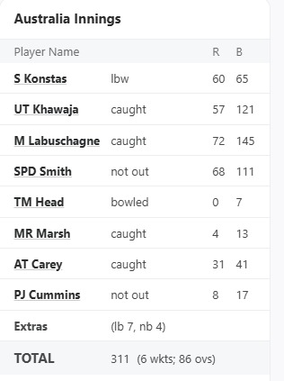 ऑस्ट्रेलिया की शुरुआत जबरदस्त रही। नए खिलाड़ी सैम कॉनस्टास (60) ने अपने पहले ही मैच में शानदार अर्धशतक लगाया। उनके अलावा उस्मान ख्वाजा (57), मार्नस लाबुशेन (72), और स्टीव स्मिथ (68*) ने भी बढ़िया बल्लेबाजी की।