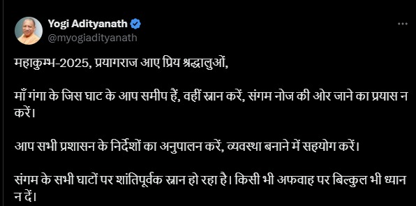 हाकुंभ मेले में भगदड़ के बाद यूपी के मुख्यमंत्री योगी आदित्यनाथ ने श्रद्धालुओं से अपील की है. सीएम योगी आदित्यनाथ ने कहा, ‘मां गंगा के जो जिस घाट के समीप है, वहीं स्नान करें. संगम नोज की ओर जाने का प्रयास न करें. स्नान के लिए कई स्नान घाट बनाए गए हैं . वहां पर भी स्नान किया जा सकता है. प्रशासन के निर्देशन का अनुपालन करें और व्यवस्था बनाने में सहयोग करिए. किसी भी अफवाह पर ध्यान ना दें.